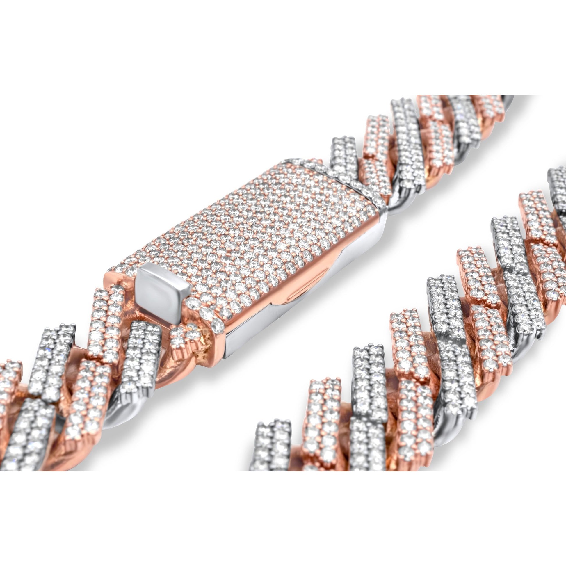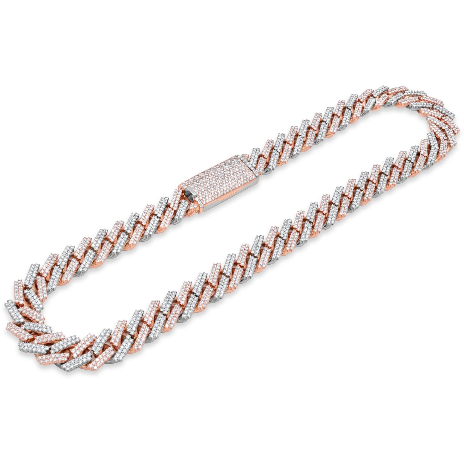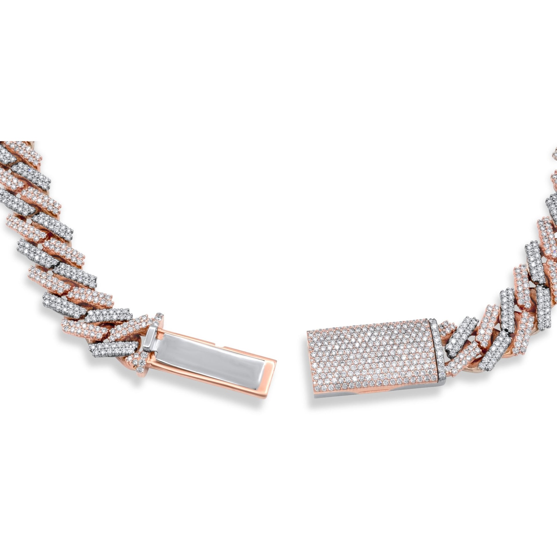 Add a touch of luxury and sophistication to your wardrobe with this exquisite 14k Solid Rose and White Gold Diamond Cuban Chain. Handcrafted from solid rose and white gold, this stunning chain features 34.25 ctw of VS quality diamonds that are sure to catch the eye. The 22" mens standard length is perfect for making a statement and the approximate weight of 340 grams adds a touch of class and glamour. Whether you're looking for a special gift for a loved one or an eye-catching piece of jewelry for yourself, this 14k Solid rose and white Gold Diamond Cuban Chain is sure to make a lasting impression.