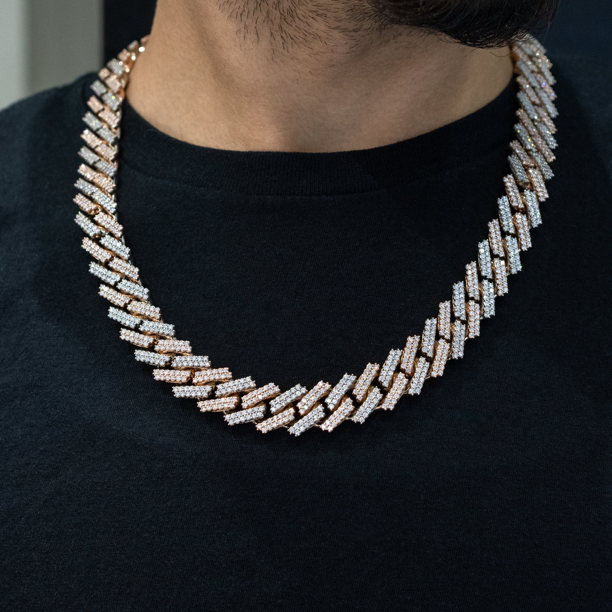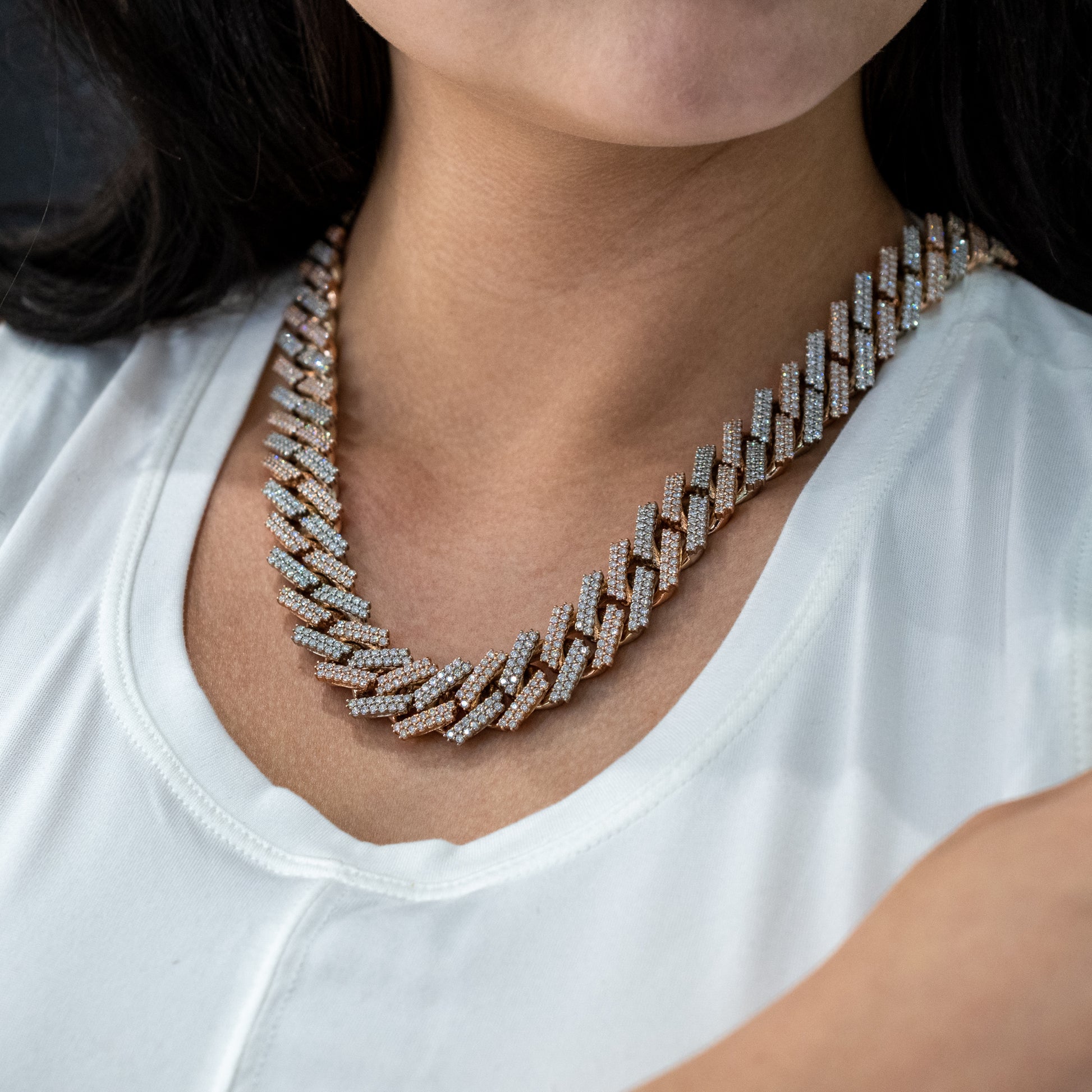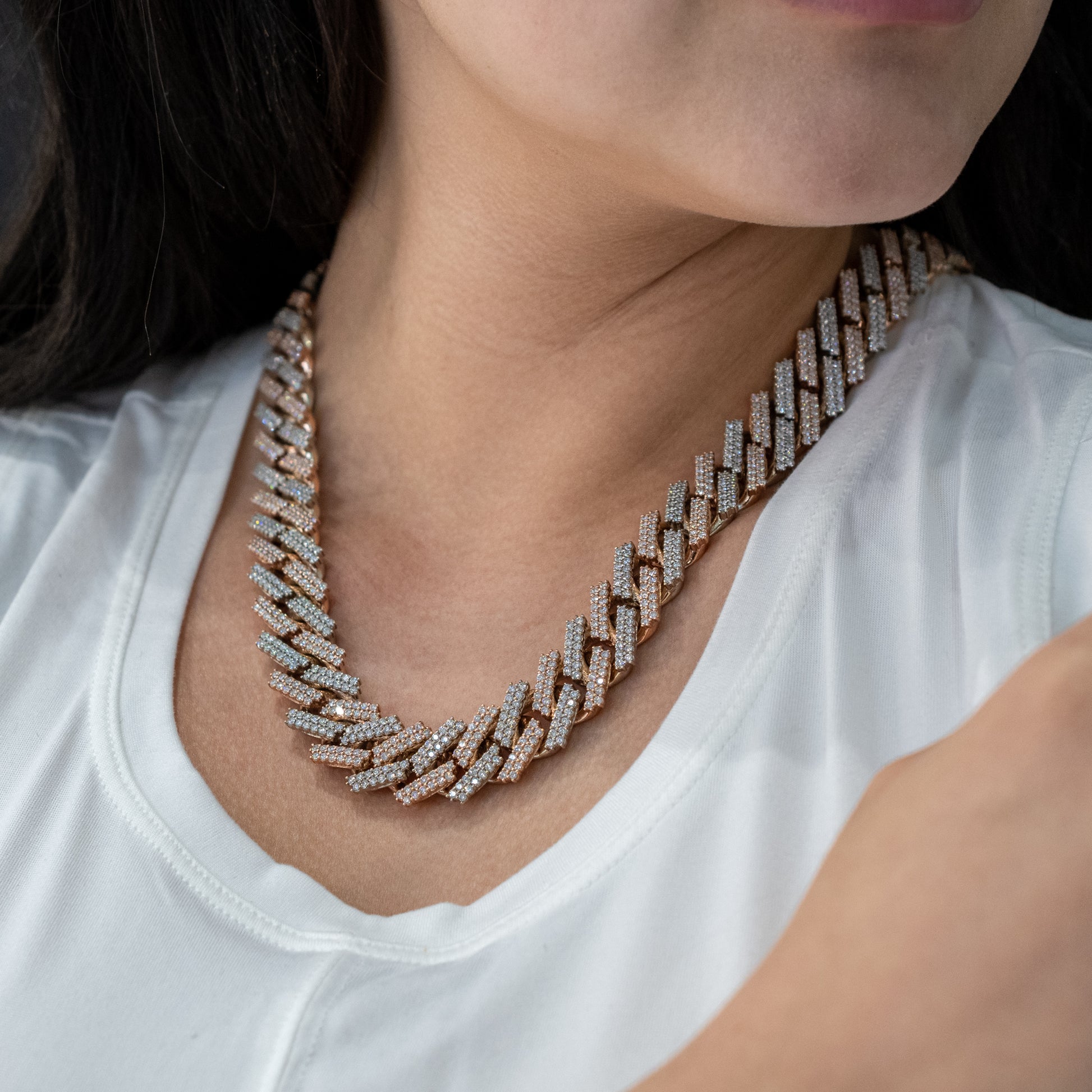 Add a touch of luxury and sophistication to your wardrobe with this exquisite 14k Solid Rose and White Gold Diamond Cuban Chain. Handcrafted from solid rose and white gold, this stunning chain features 34.25 ctw of VS quality diamonds that are sure to catch the eye. The 22" mens standard length is perfect for making a statement and the approximate weight of 340 grams adds a touch of class and glamour. Whether you're looking for a special gift for a loved one or an eye-catching piece of jewelry for yourself, this 14k Solid rose and white Gold Diamond Cuban Chain is sure to make a lasting impression.