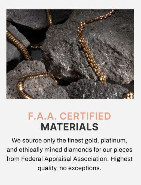 We source only the finest gold, platinum, and ethically mined diamonds for our pieces from Federal Appraisal Association. Highest quality, no exceptions.