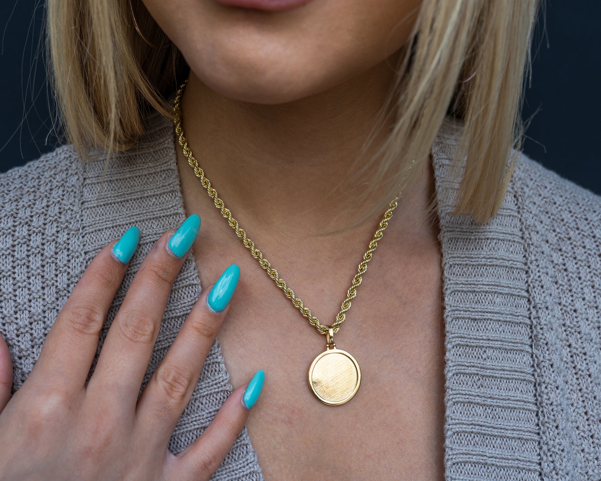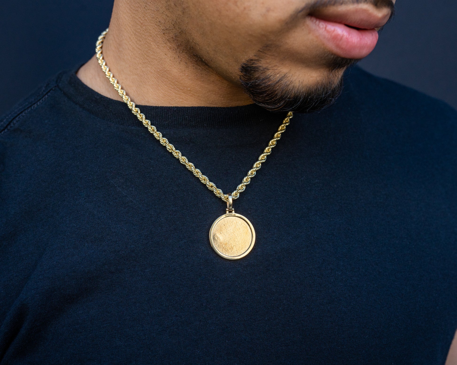 This beautiful 10K Solid Gold Circle Picture Pendant is the perfect accessory for anyone looking to add a touch of luxury to their jewelry collection. Expertly crafted from 10K solid yellow gold, this medium-sized pendant weighs 5.4 grams, making it ideal for everyday wear without compromising on style.