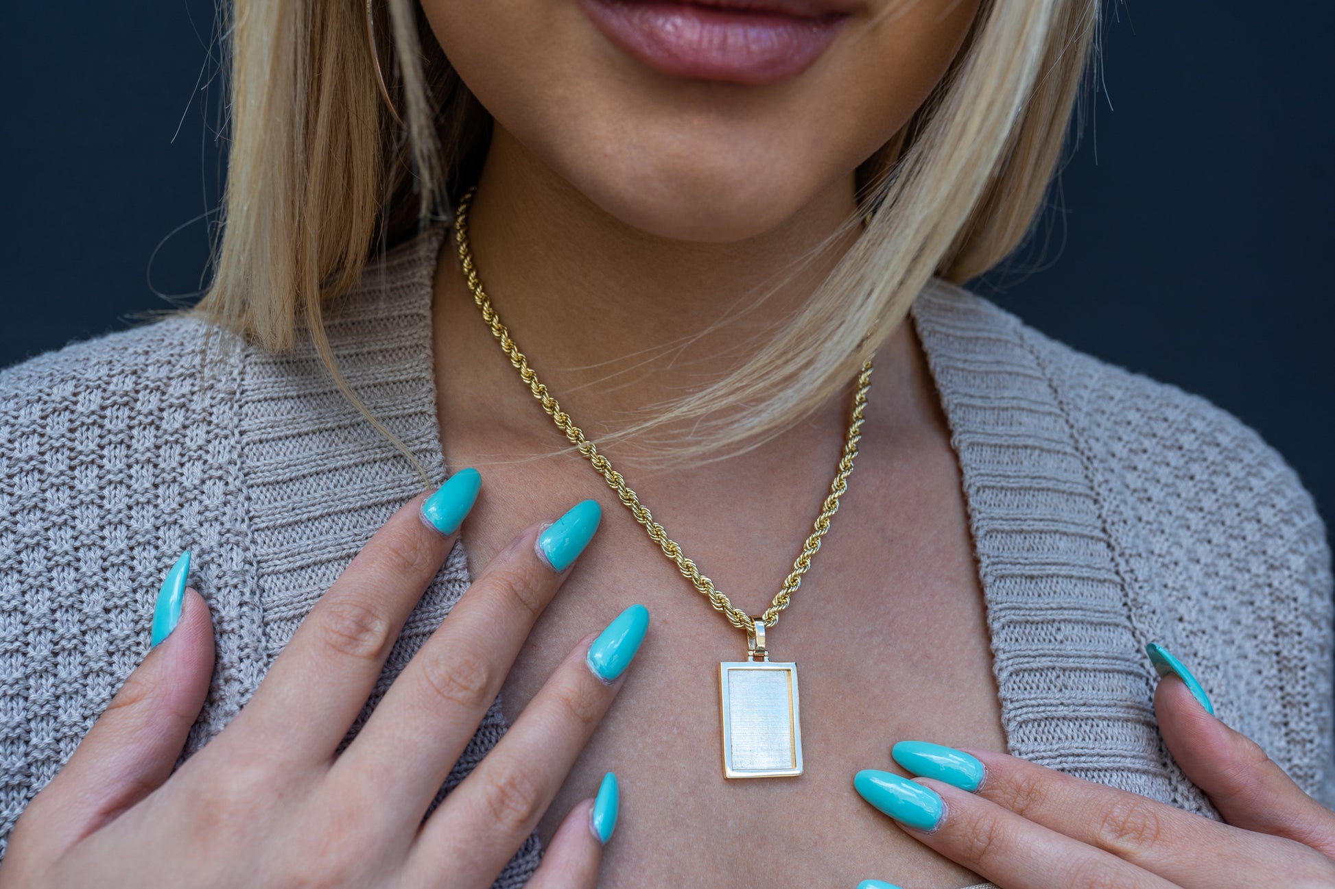 This beautiful 10K Solid Gold Rectangle Picture Pendant is perfect for anyone looking to add a touch of luxury to their jewelry collection. Expertly crafted from 10K solid gold and weighing 7.3 grams, this sophisticated pendant features a sleek rectangular design that offers both durability and everyday elegance. Measuring 1.01 inches in length and 0.78 inches in width, it’s the perfect accessory for any occasion, whether you're dressing up for a special event or elevating your daily look.
