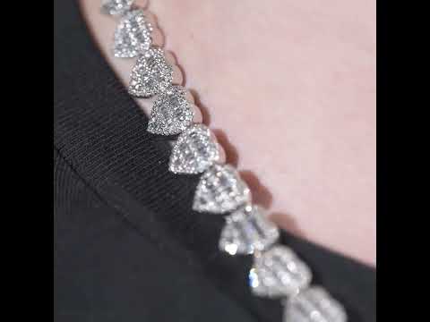 Indulge in opulent elegance with our 10k White Gold Round and Baguette Diamond Heart Necklace. With a total carat weight of 7.70 ctw, this stunning piece features a symmetrical design of heart-shaped gemstones, exuding luxury and refinement. Crafted from white gold and adorned with highly reflective stones, this necklace is a statement accessory for special events or upscale occasions. Elevate your style with this exquisite, high-end designer jewelry.
