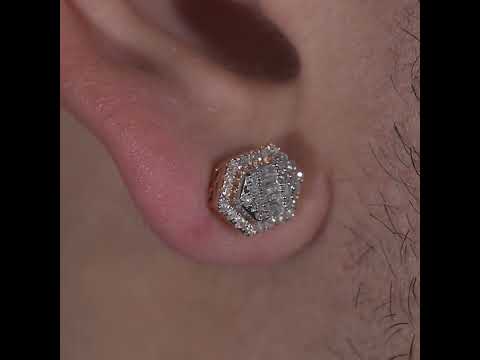 Elevate your style with these stunning 14k Rose Gold Diamond Earrings. Crafted with precision, the hexagonal-shaped frames feature a dazzling cluster of baguette-cut diamonds, creating a captivating geometric pattern. The rose gold metal adds a touch of modern elegance to these luxurious earrings. Perfect for special occasions or a night out. Experience the timeless beauty of real diamond earrings.