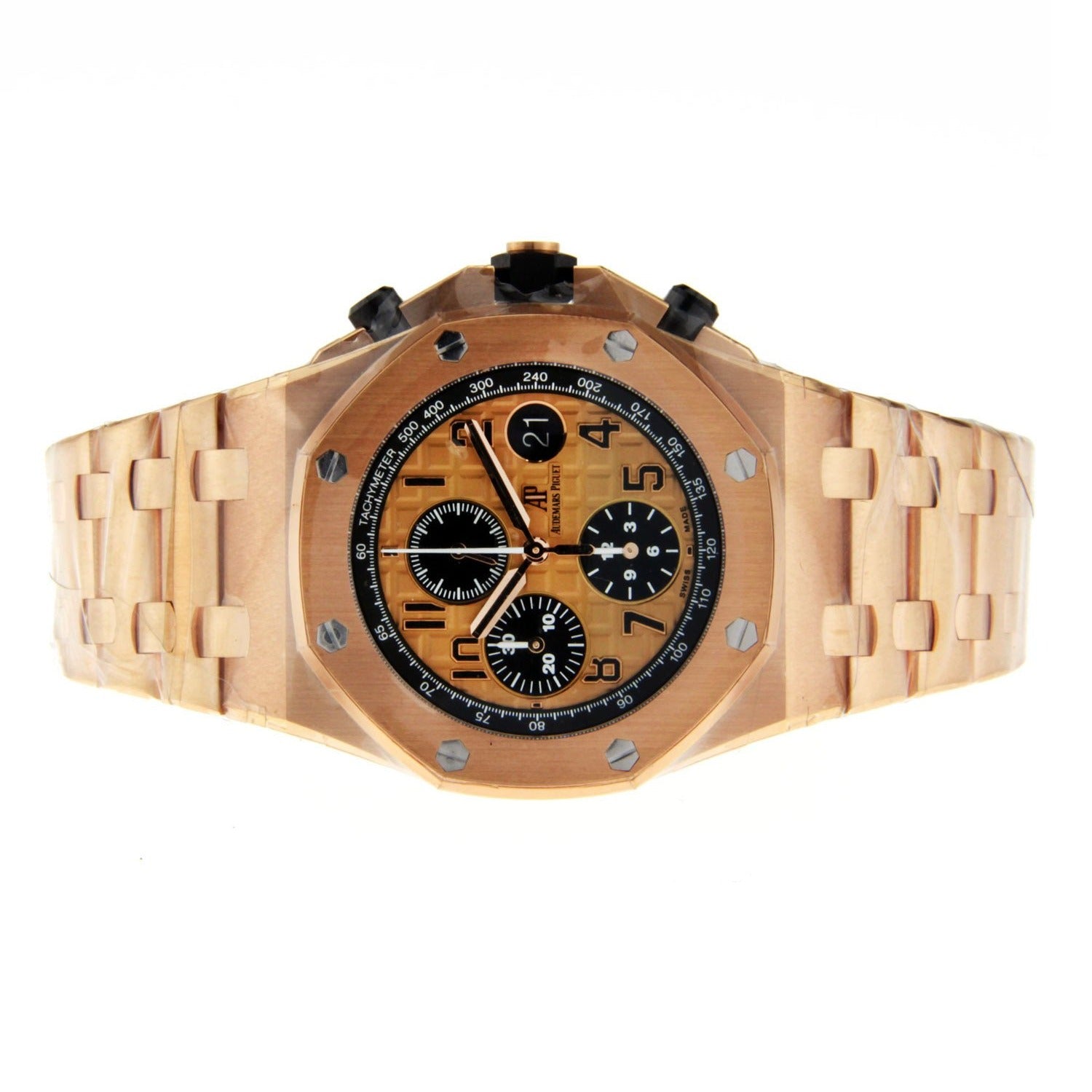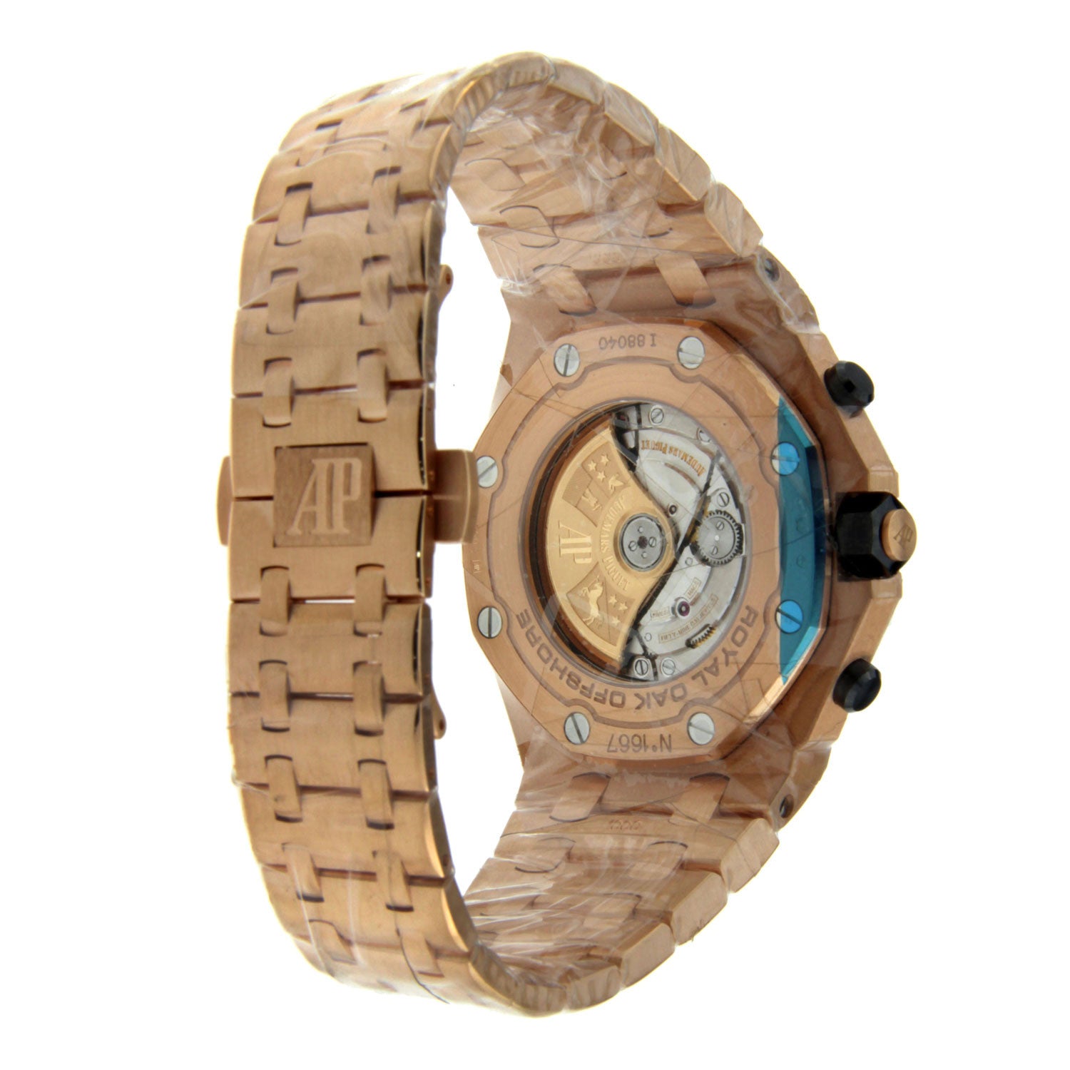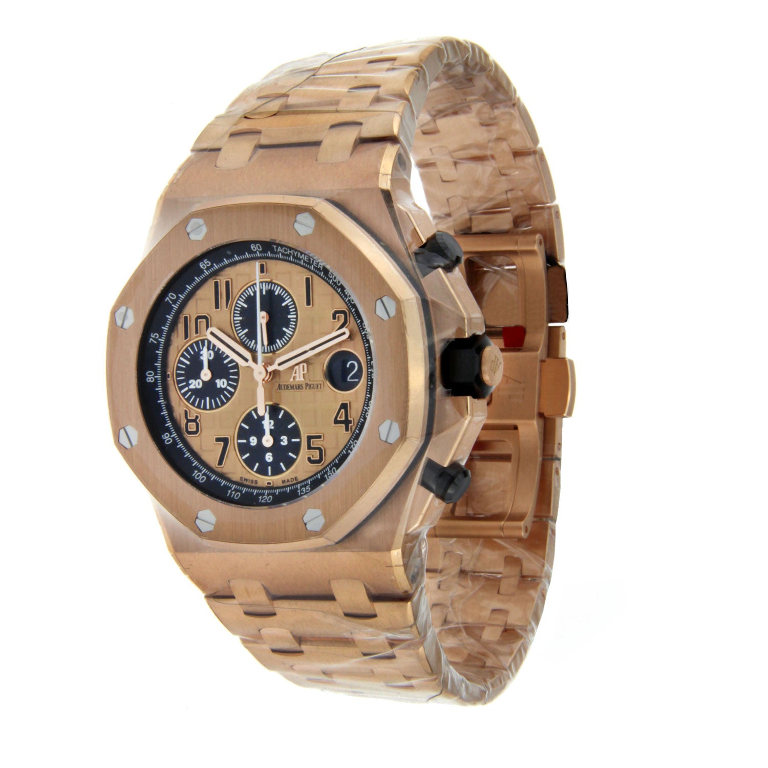 This is 42mm 18K Rose Gold Audemars Piguet Royal Oak Offshore. the watch is 14.18mm thick with a sapphire back, screw-locked crown, and glare proof sapphire crystal with rose gold-toned dial. The black counters and arabic numerals with rose gold Royal Oak hands in a luminescent coating add a distinct touch to this luxurious watch. Contains a black inner bezel. This watch has a caliber 3126 / 3840 automatic movement with chronograph, hours, minutes, small seconds, and date.  An easy to us AP folding buckle makes it easy to remove or wear, but we are sure you will not want to take this watch off!