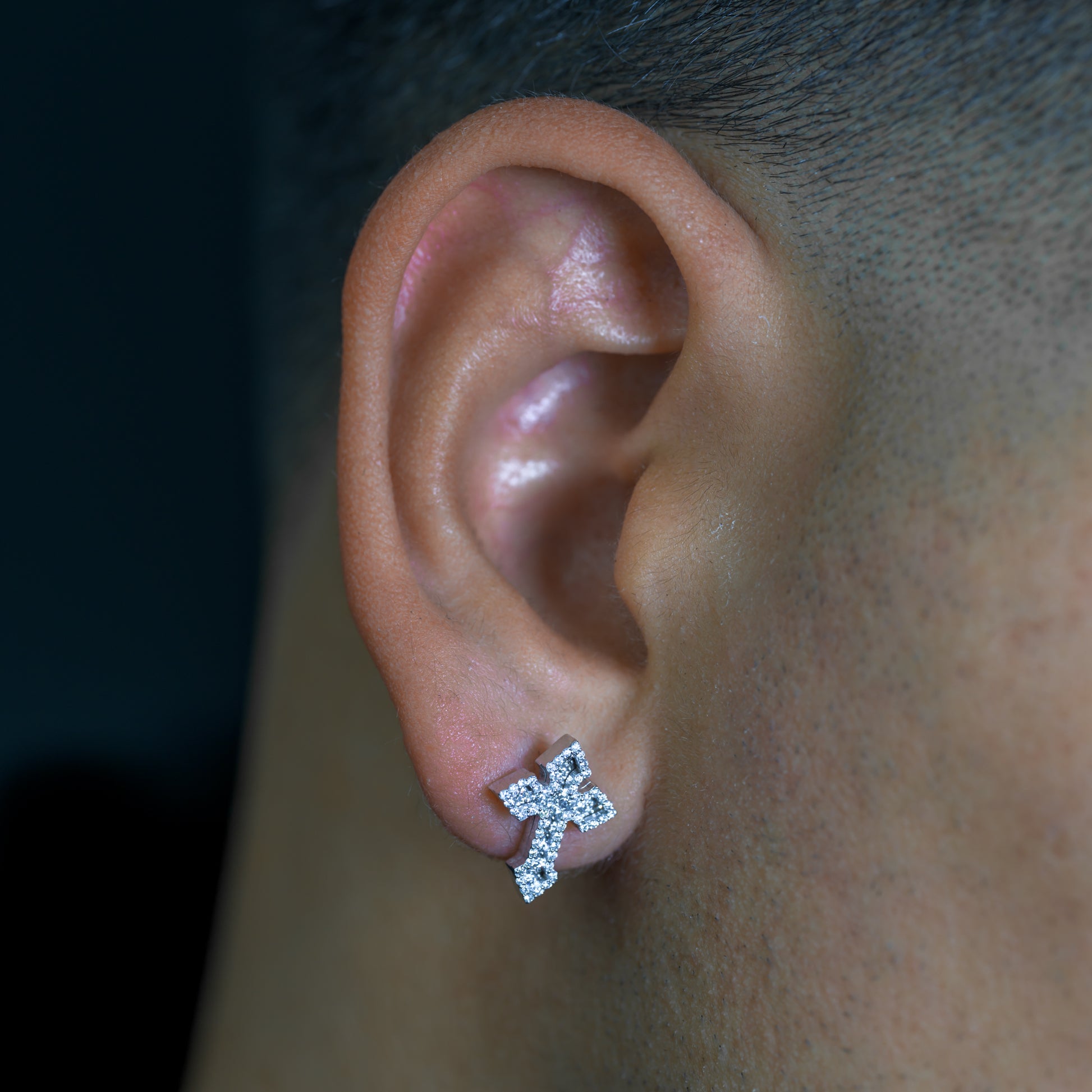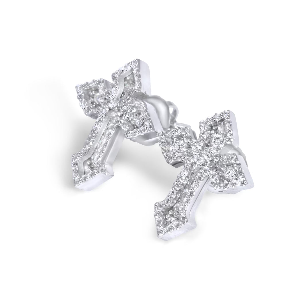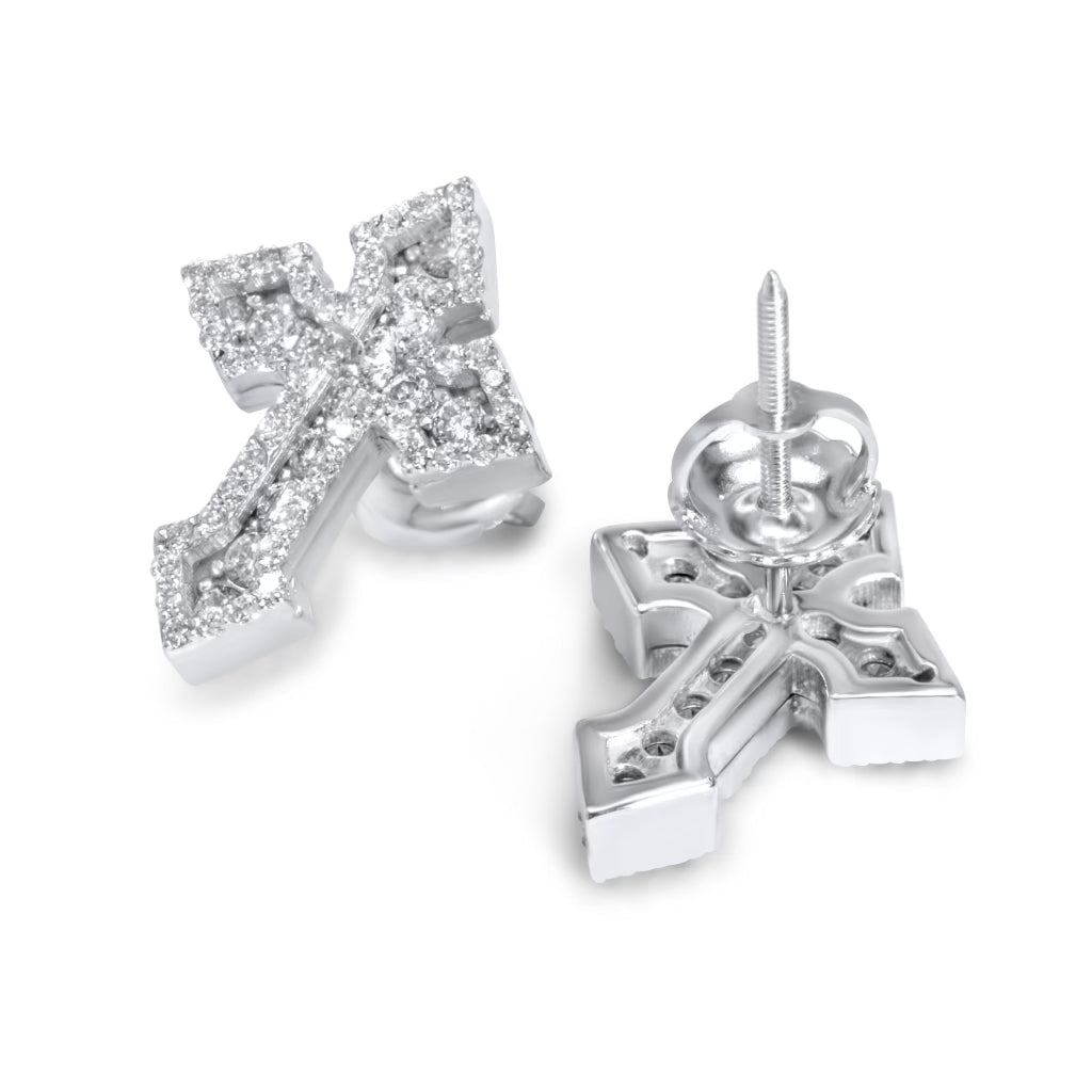 Introducing our 10K White Gold Diamond Cross Earrings. These beautiful earrings are perfect for the stylish individual who wants to make a statement. These earrings are made of high-quality gold and set with .7 carats of pure white diamonds. The cross design is eye-catching and the white gold color is sure to catch anyones attention. Whether you're dressing up for a special occasion or just looking for a simple yet stylish piece of jewelry, these earrings are sure to please. Order your pair today!