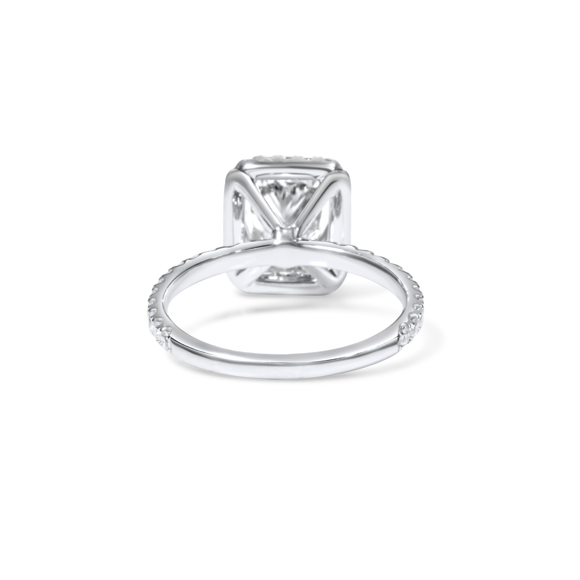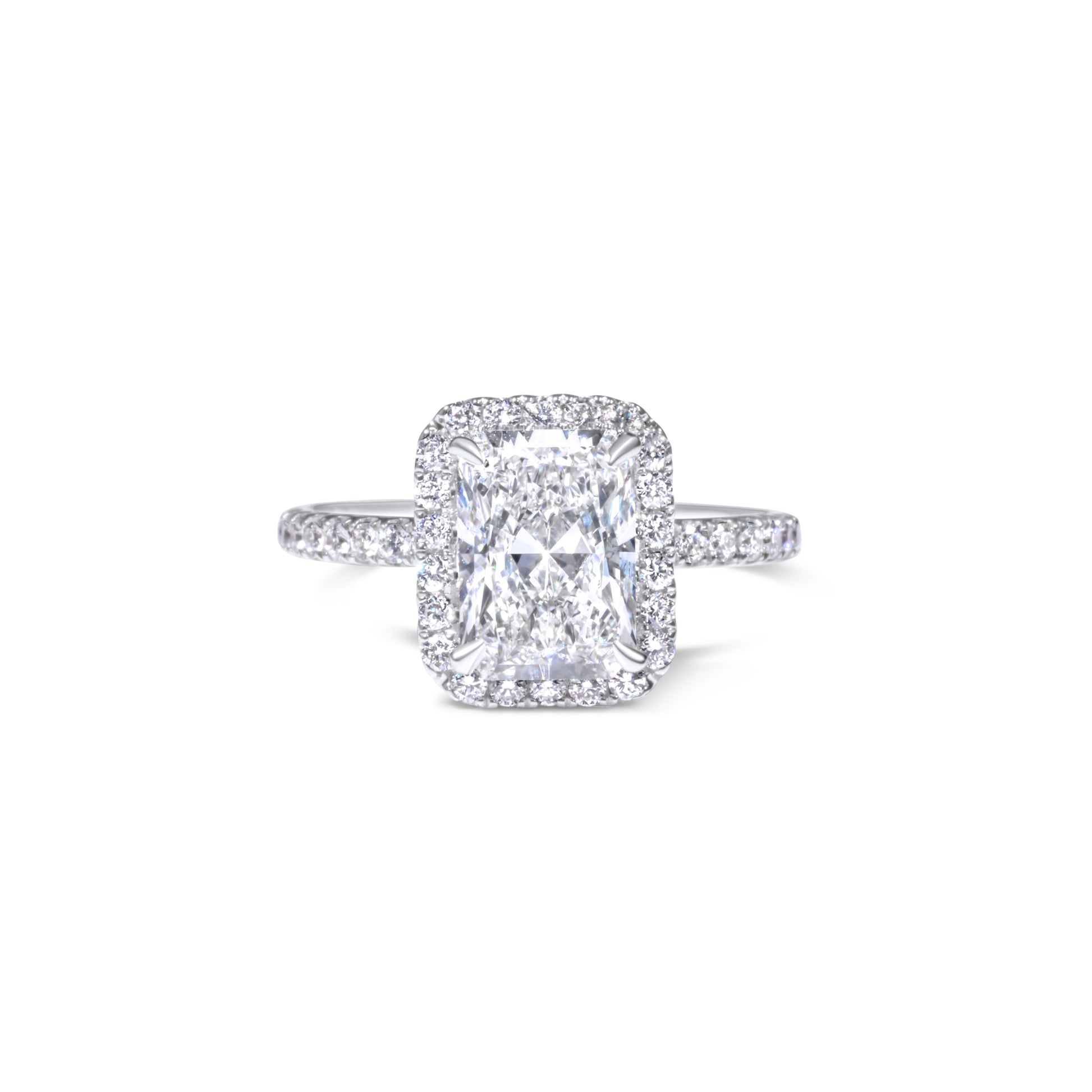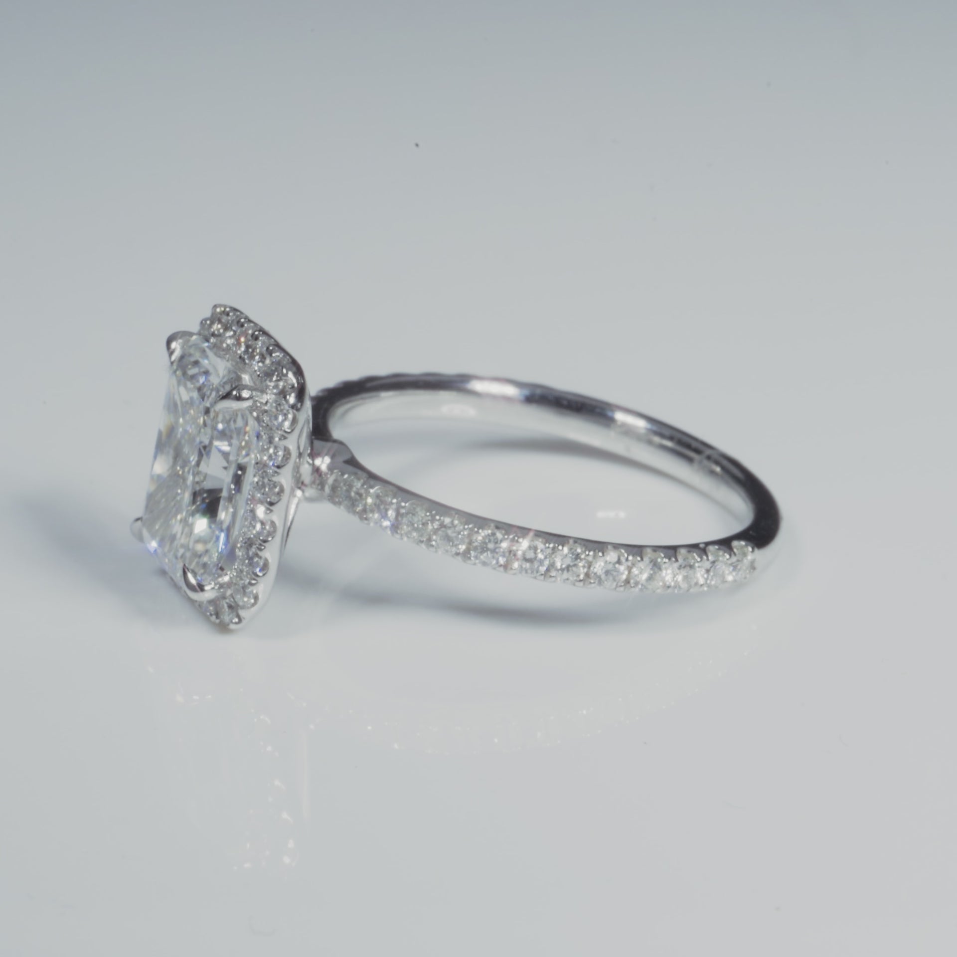 18k White Gold Emerald Diamond Ring Featuring a 2.09ct center stone followed by .52ct round diamonds all around the bezel and band.