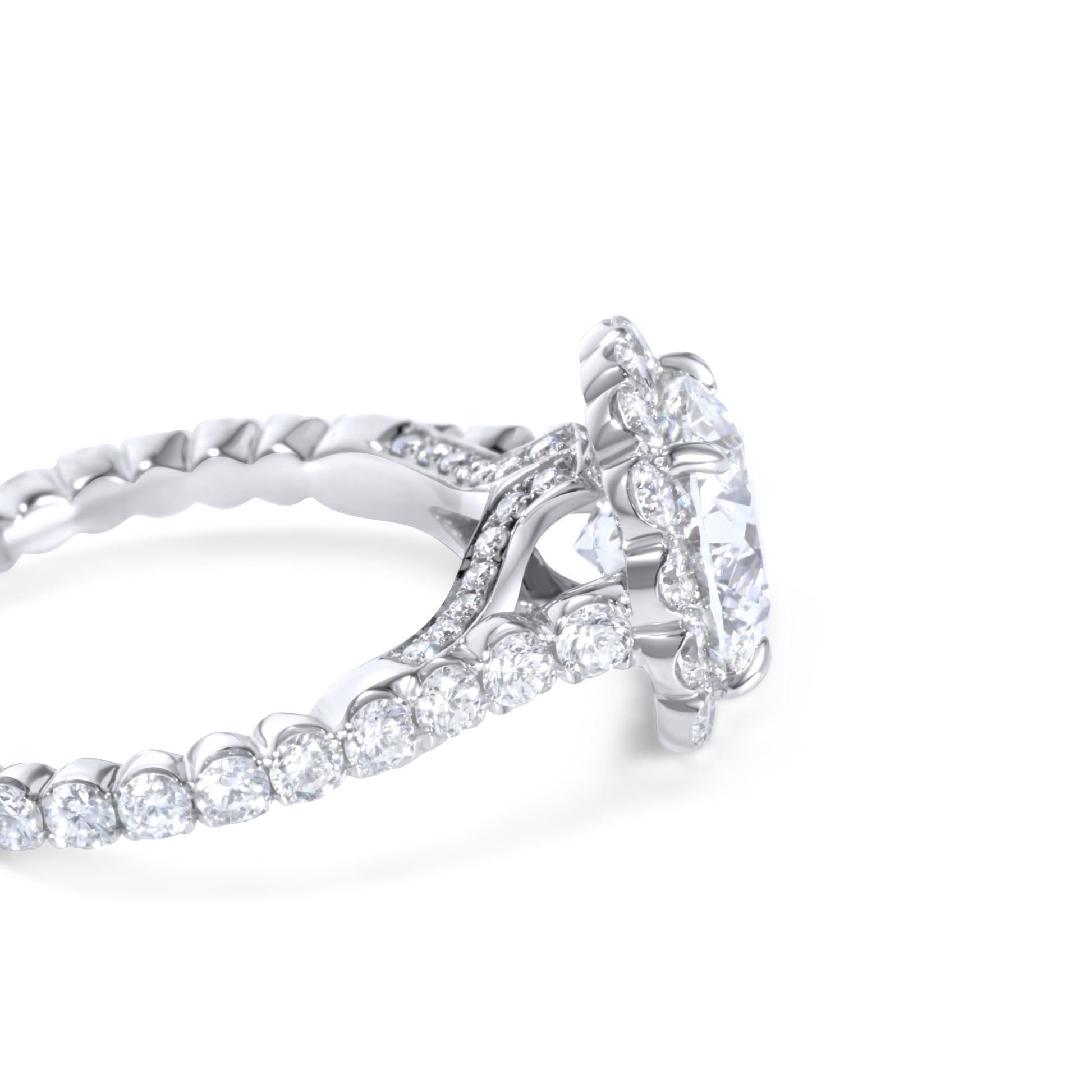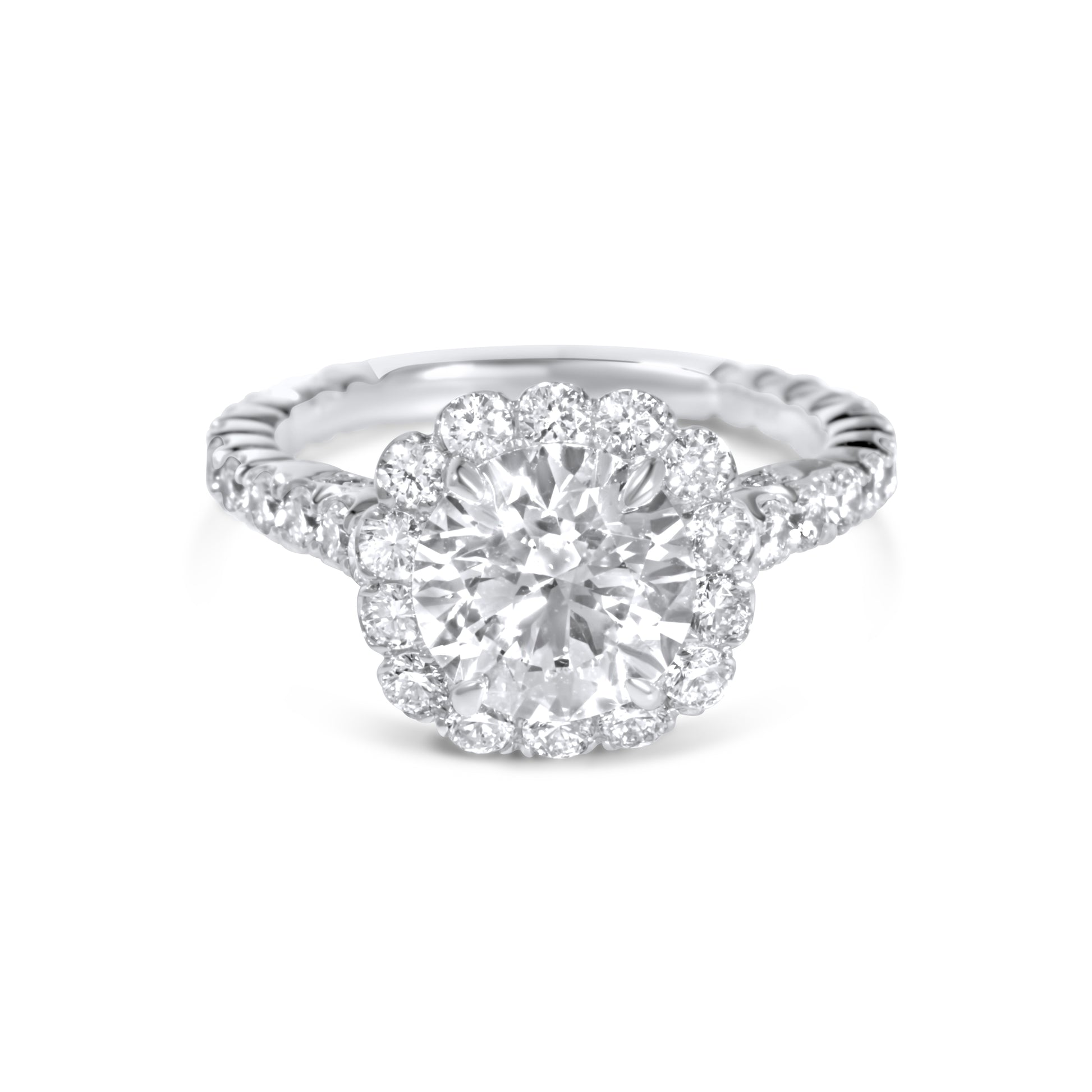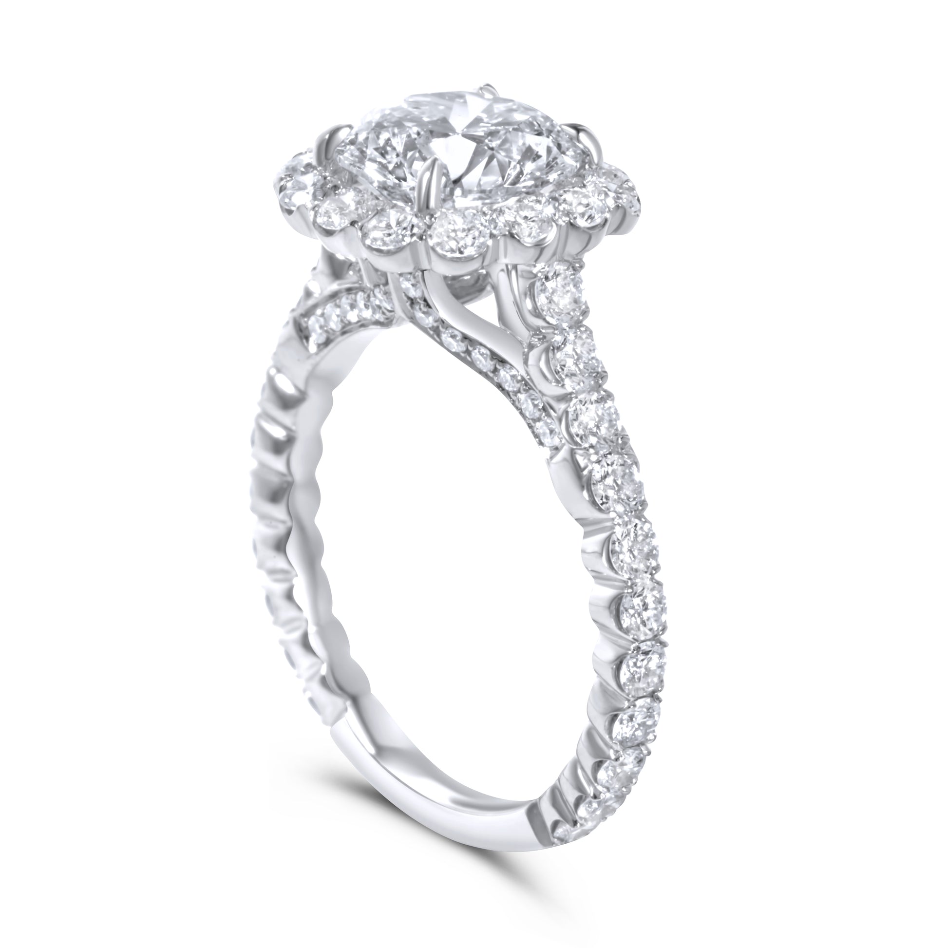 18k White Gold Round Diamond Ring Featuring a 2.09ct center stone surrounded by 1.40ct round diamonds